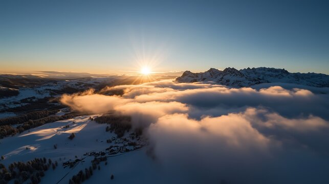 Stunning Aerial View Of Snow Covered Mountains And Clouds At Dawn Images