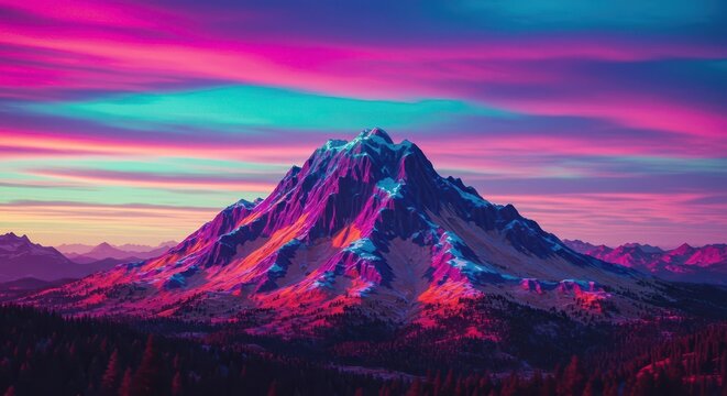 Majestic mountain range illuminated by vibrant colors of sunset or sunrise creates a dramatic and surreal landscape, showcasing a stunning sky painted with brilliant pink, teal, and purple hues over