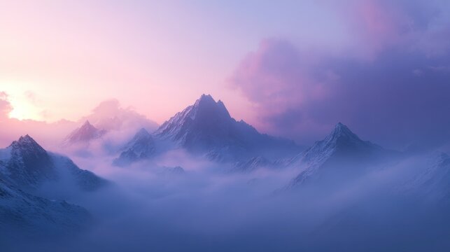 Majestic mountain range at sunrise with low clouds