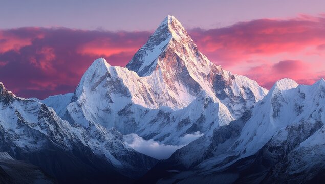 Pink sunset over snowy mountains, cloudscape, nature wallpaper