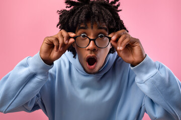 Shocked young black teen guy opening mouth in awe, touching eyeglasses, looking at camera on pink studio background. Emotional African American teenager screaming OMG, feeling surprised
