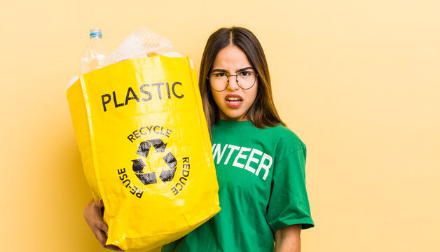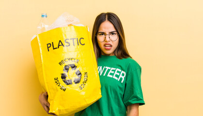 pretty hispanic girl feeling puzzled and confused. ecology concept