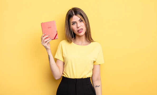pretty woman feeling puzzled and confused. planner concept