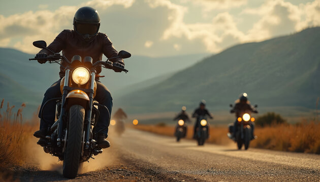 Sturgis bikers ride on countryside road. Motorcyclists navigate challenging terrain. Adventure, skill, excitement. Group rides in mountains. Freedom, lifestyle, travel. Test of endurance on rough