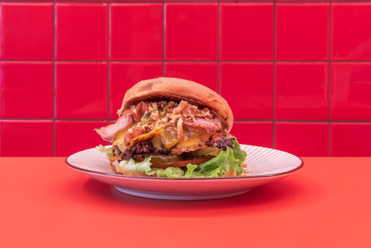 Homemade burger creation with a brioche bun, our own ground beef, and garden vegetables, with a rustic style