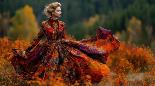 Fashion woman dressed in autumn colors in the forest at fall season. Generative AI illustrations