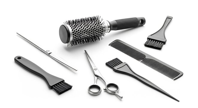 Collection of professional hair styling tools including brushes combs scissors and dye brushes isolated on white background