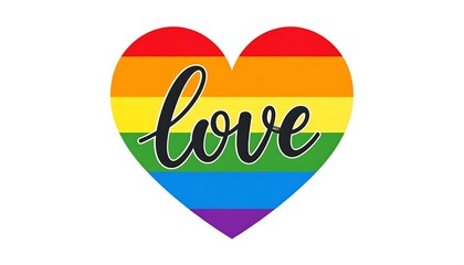 A colorful heart with rainbow stripes, "love" in stylish script
