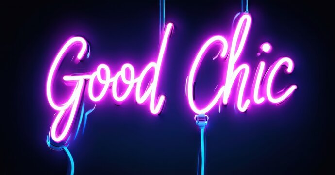 Bright pink neon sign displays Good Chic. Dark background enhances glowing script lettering. Modern aesthetic, stylish presentation.