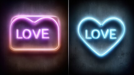 Valentine’s Day neon glow posters.  Neon tube hearts, "LOVE" in neon script, sparkle effects, dark night background. Party flyer, bar voucher,
