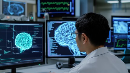 A machine learning expert working on AI algorithms, modern office with multiple screens displaying code and data in the background, High-tech style