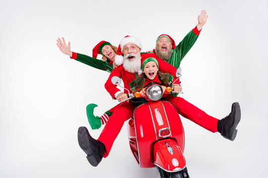 Portrait of childish carefree cheerful friends riding motor bike having fun fooling isolated over white color background