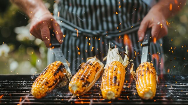 A chef grilling corn on the cob over an open flame at a summer barbecue.