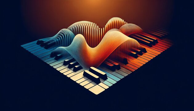 A stylized piano keyboard with abstract waves of sound emanating from it, using a blend of warm and cool color tones.