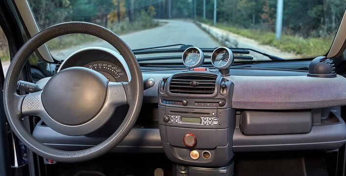 Car steering wheel and interior background, modern city car elements close view. Car inside interior