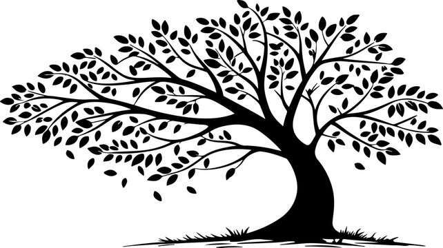 A stylized black and white image of a tree with many leaves, its trunk partially obscured by a small hill.