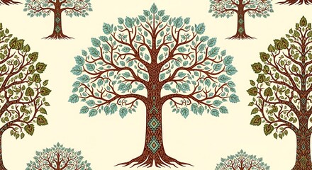 Intricate arboreal pattern featuring stylized trees with decorative trunks on a cream backdrop creating a nature
