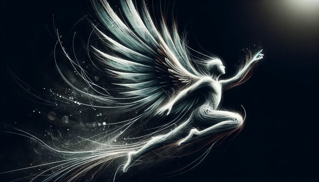 Radiant angel with halo and wings ascending in skies