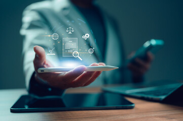 Professional businessperson hand holds stylus interacting digital interface. Icons represent legal compliance, global network, data analysis, strategic planning, process management. Concept portrays