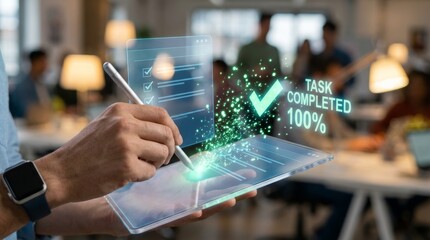 Businessman using stylus on digital checklist interface for task management. Concept of workflow efficiency, quality control, project tracking, digital document process, and business productivity.