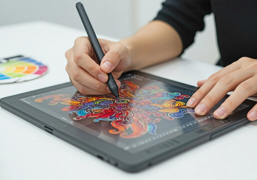 Graphic designer sketching colorful concepts on digital tablet with stylus pen