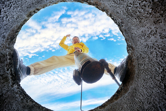 A male technician submerging a septic pump into the sewage water of a storage tank, emphasizing his work in wastewater management.