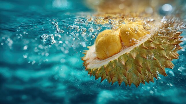 Golden-yellow fleshy durian submerging into turquoise water close-up detail natures beauty