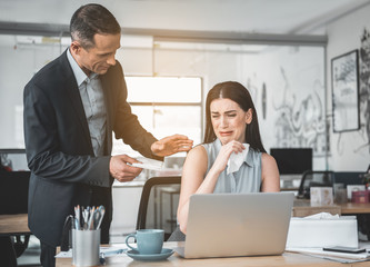 Middle aged serious mentor helping female employee with computer work, economic report, boss checking subordinate work, looking at screen, worker reporting to supervisor, asking questions