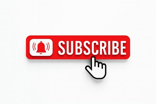 Red subscribe button with a notification bell icon and a cursor hand pointing to it on a white background