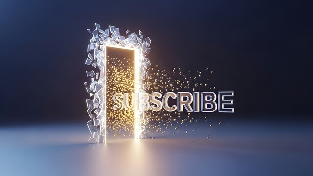 Glowing gold subscribe button shaping double-lobed metallic emblem on beige background