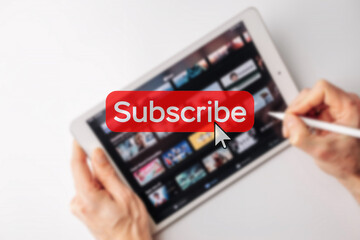 Subscription concept. Big red subscribe button with bell icon appear on smart mobile phone in hand. Smartphone horizontal style holding by businesswoman who watching on entertainment applicatiion.
