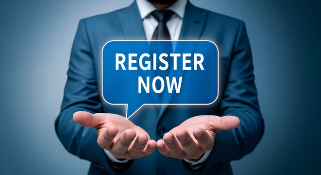Businessman in blue suit holding virtual blue speech bubble with white text register now against a gradient blue background