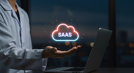SaaS - software as a service concept with man on blurred blue city light background