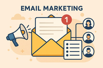 Illustration of email marketing campaign with letter envelope notification megaphone and connected subscriber profiles
