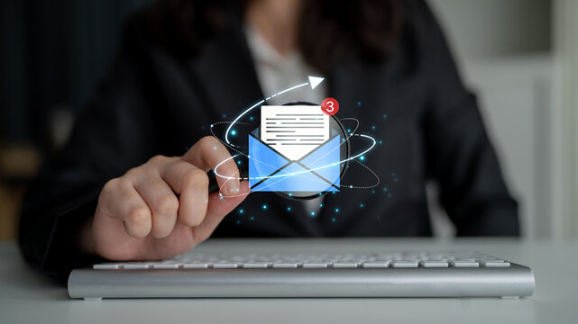 Concept of digital communication and correspondence. Receiving a new message or notification in an email inbox, representing online information exchange and alerts. Fermion