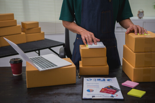An Asian man carefully prepares a package for a customer's online order, methodically placing items in a box, sealing it securely, and attaching a shipping label for prompt delivery.