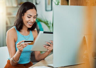 Online shopping with credit card and tablet while paying for her streaming subscription or bill. Happy woman enjoy break and online shopping or purchasing items on eCommerce website with fintech app