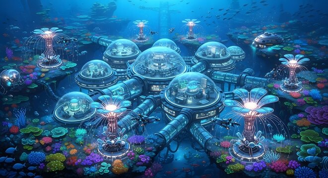 Underwater base future city ocean research station coral reef marine life exploration station fantasy art