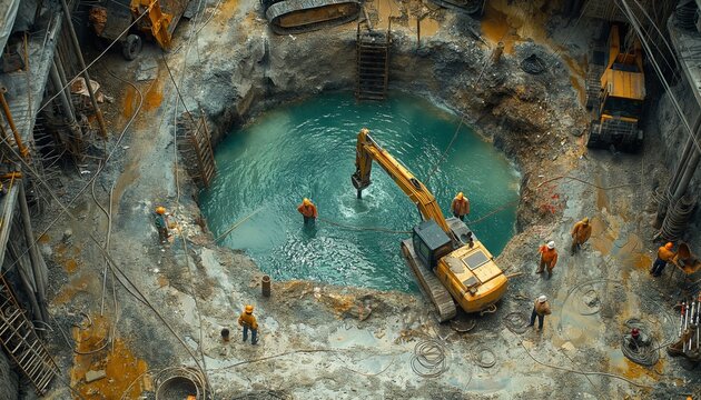 Aerial view of workers and machinery in a water-filled construction pit Suggests teamwork and engineering