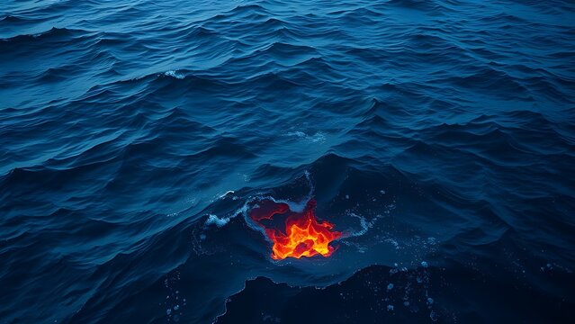 Deep blue ocean waves with glowing cracks beneath the surface, hinting at volcanic activity.