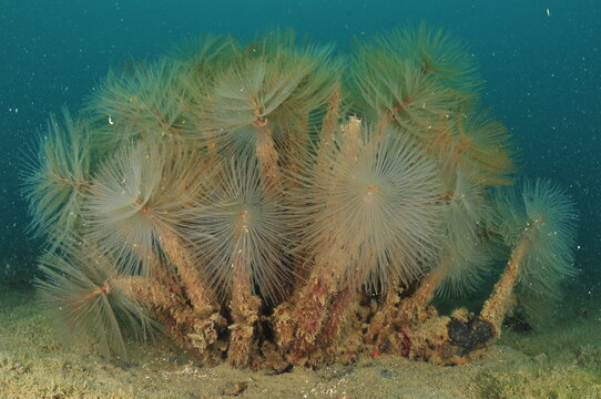 Relatively large aggregation of pest Mediterranean fanworm Sabella spallanzanii in murky water of silty harbour. Location: Mahurangi Harbour New Zealand