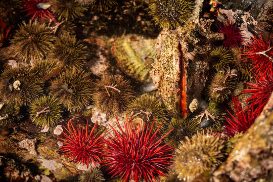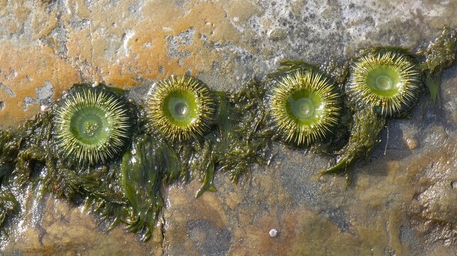 Sea urchins surrounded by vibrant green algae on a textured rocky ocean floor illustrating marine biodiversity and ecosystem dynamics.