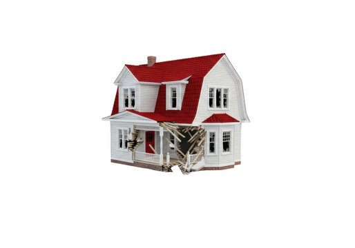 Hyper-realistic 3d render of a white suburban house with red gambrel roof, violently pitching into a deep black geological fissure on a white void. Symbolic visual metaphor for economic collapse