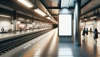 Blank billboard mock up in a subway station with walking people, underground interior. Urban light box inside advertisement metro vertical