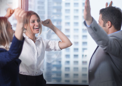 Excited colleagues celebrating success in modern office