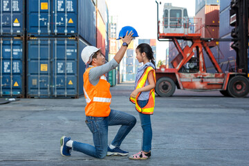 Father and little daughter wearing a safety helmet at Container cargo site. Business heir concept. Happy father and daughter wearing safety helmet work site. Business heir concept.