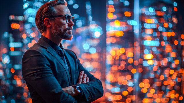 Confident businessman overlooking city lights at night
