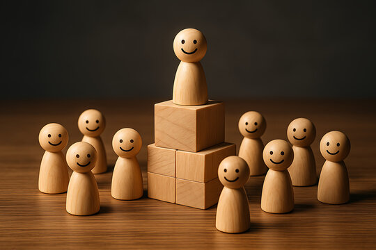 Smiling leadership and teamwork concept with happy wooden figure on top block podium surrounded by positive successful team members