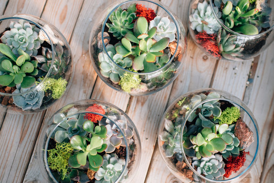 Green, red and pink succulent plants and green cactus in modern geometric cement planters