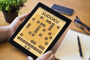 Student  is trying to solve sudoku with  color pencil as hobby at outdoor